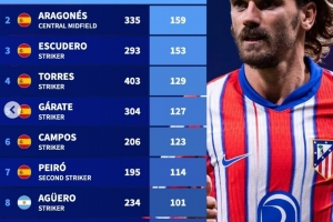 马竞队史射手榜:格列兹曼200球居首,托雷斯、阿圭罗在列