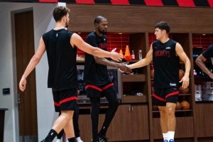 火箭官推晒训练营第4日:KD击掌谢泼德 卡佩拉与亚当斯相拥
