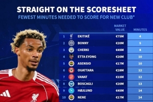 今夏新援最快攻入首球排名:埃基蒂克4分钟居首,博尼5分钟次席