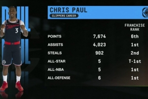 洛杉矶船长!保罗快船时期助攻&入选最佳阵等4项数据队史第一