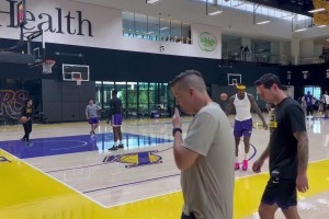 08年美国梦八队内训练,詹姆斯和保罗互相打闹,甜瓜一旁看着