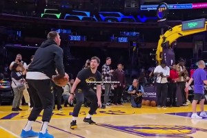 东契奇投篮热身调戏训练师:来防我呀!然后调高弧度命中三分😂